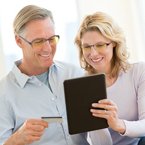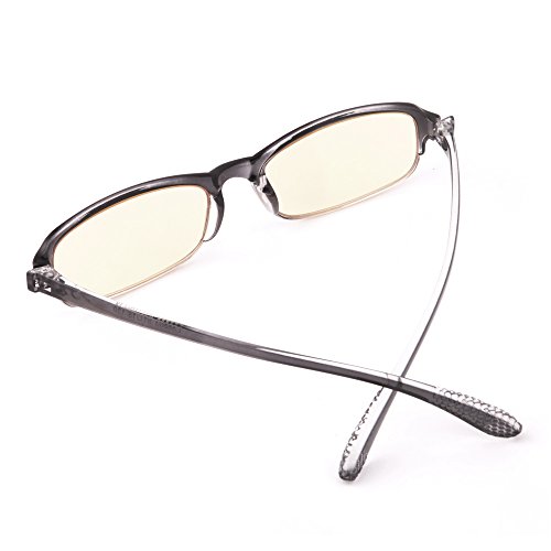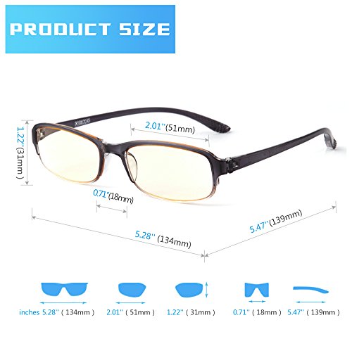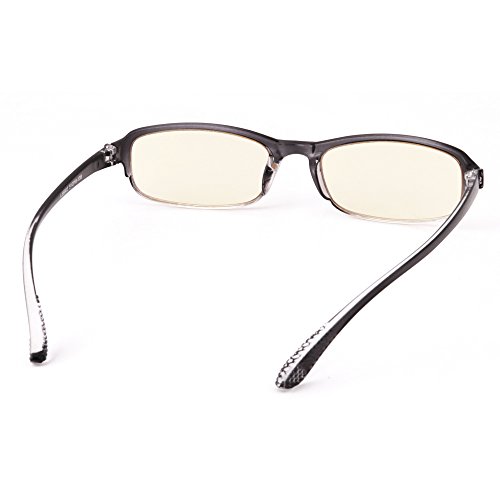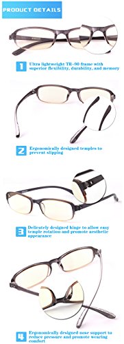 -. Feature : ANTI BLUE LIGHT & UV - our patented amber tinted lens offer perfect balance of filtering 70% very harmful blue light in the 400~440 nm wavelength and allowing transmittance of 74% less harmful or even beneficial blue light in the 440~500 nm wavelength; 100% block UV / NO MORE EYE STRAINS & GLARES - anti reflective (AR) coating and tinted lens eliminate glare, improve contrast, and enhance depth perception, reducing digital eye strains, eye fatigue, and headache, optimizing visual acuity clarity with fewer distractions and more viewing comfort, and helping fall asleep faster. Ideal for working, gaming, or browsing on PC, tablets, smart phones, TV or near office LED lights. / LIFETIME BREAKAGE WARRANTY! TR90 FRAME offers superior flexibility, durability and wearing comfort. Classic gradient grey frame is ideal for both men and women. / MAGNIFICATION STRENGTHS are +1.00 diopters through +4.00 diopters with all half step increments included; FDA REGISTERED manufacturer and product / PACKAGE includes 1 hard case and 1 soft cleaning cloth. The outer box is made from 100% recycled fiber and is 100% recyclable.