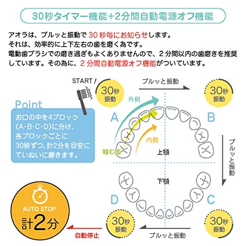 6. Automatic power OFF (notify by vibration every 30 seconds) within 2 minutes of a proper tooth brushing time recommended by a dentist