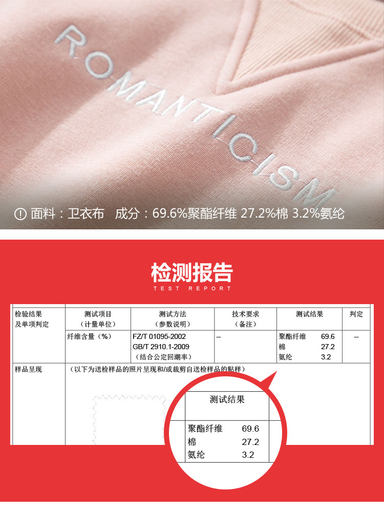 | 面 料:主布:69.6%聚酯纤维 27.2%棉 3.2%氨纶 罗纹:97.9%棉 2.1%氨纶颜 色:灰色,粉色 |