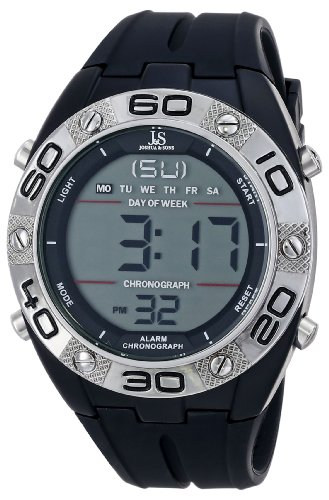 -. Binding : Watch -. Brand : Joshua & Sons -. Department : mens -. EAN : 0848572026161 -. Feature : Round silver-tone watch with 49mm metal case and mineral dial window / Quartz movement with digital display / Featuring textured bezel with decorative screws, backlight, alarm, day display, and black silicone band with buckle closure / Water resistant to 99 feet (30 m) -. IsAdultProduct : 0 -. Label : Joshua & Sons -. Manufacturer : Joshua & Sons -. Model : JS66BK -. MPN : JS66BK -. PackageQuantity : 1 -. PartNumber : JS66BK -. ProductGroup : Watch -. ProductTypeName : WATCH -. Publisher : Joshua & Sons -. ReleaseDate : 2013-12-12 -. Studio : Joshua & Sons -. Title : Joshua & Sons Men's JS66BK Digital Metal Watch with Black Silicone Band -. UPC : 848572026161