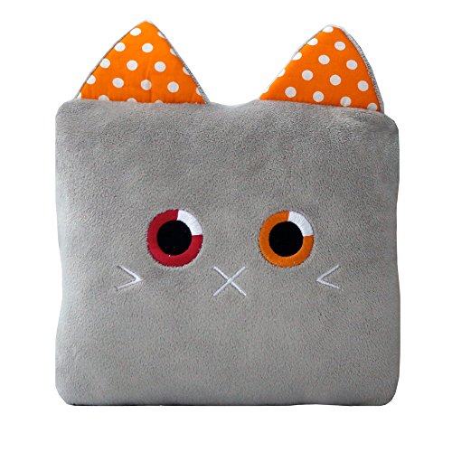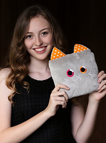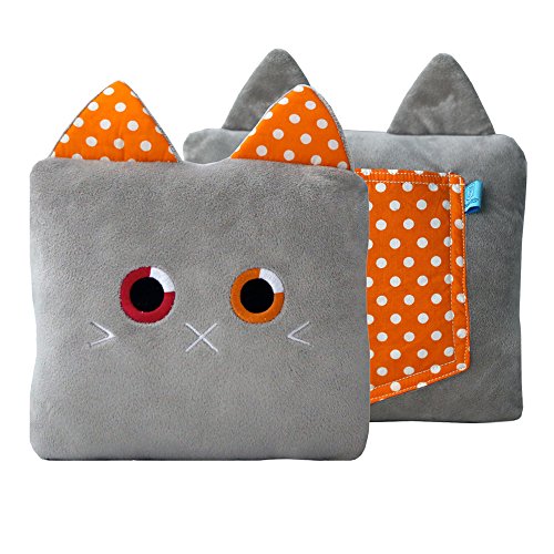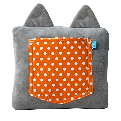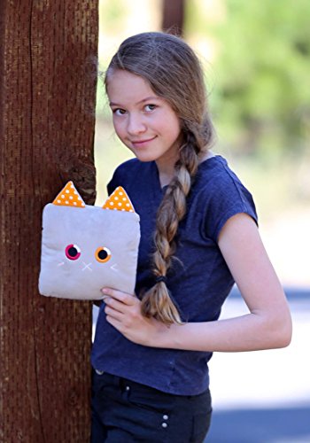 [Description] Soft 7.5`` square plush kitty cat pillow with orange polka dot cotton fabric details Useful 4x5`` plush-lined back pocket to hold a phone_ notebook_ eyeglasses_ or tooth fairy goodies Bright pink and orange embroidered eyes_ and perky ears made from cotton polka dot fabric and plush Designed by young entrepreneurs_ Sydney (16) and Toni (13) from palo alto_ California Made with the highest quality materials and care