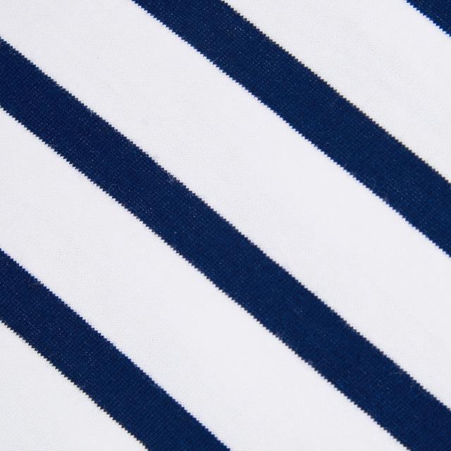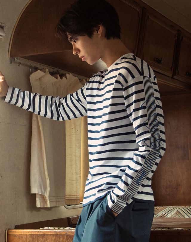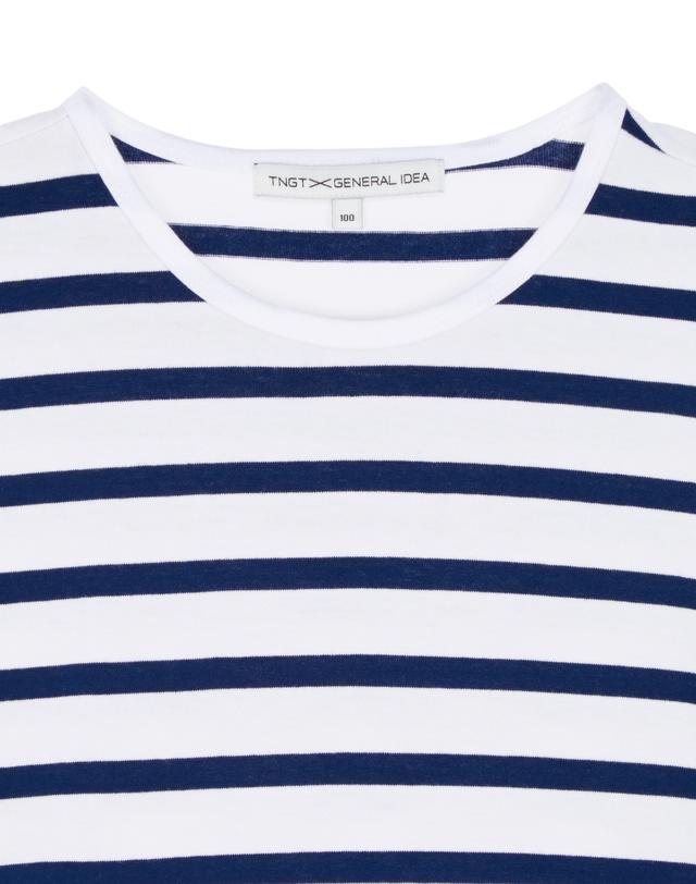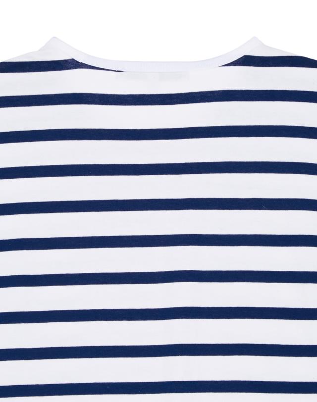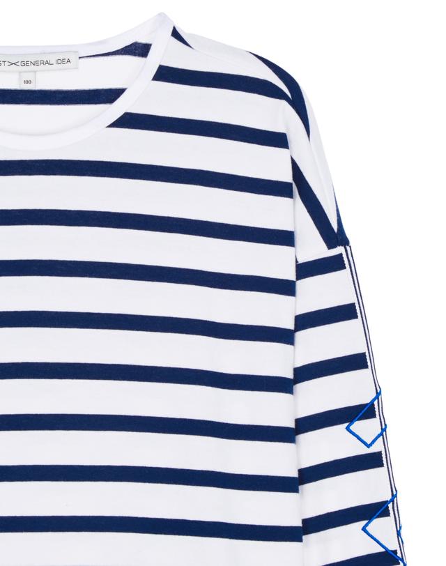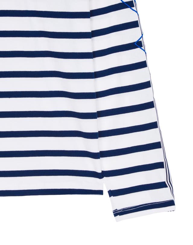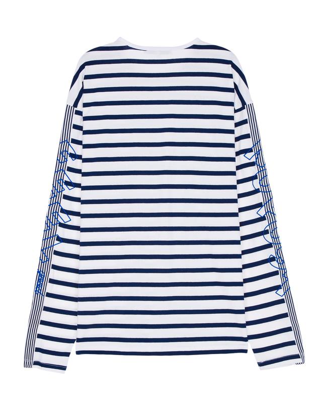 스트라이프 패턴의 소맷단으로 자수와 스트랩 장식이 유니크한 외관을 보여주는 티셔츠입니다.