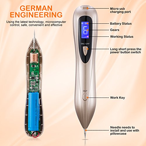 -. Feature : SAFE & EFFECTIVE: German engineering mole remover machine uses latest microcomputer control technology with low temperature and high frequency. Instantly sweep mole, skin tags, freckles, age spot, small tattoo, etc, without hurting the normal skin, no bleeding and no side-effect. Make your facial & body skin looks smooth and soft without any pigmentation. / PORTABLE & EASY TO USE: This travel-size skin tag remover is easy to grip and operate. Just cleaning the needle and your skin with alcohol before use, gently sweeps around the spot and then use the swabs to wipe off, you will find the pigments will be gone quickly. It's better to take sometime to test on your feet or arms before first time using. Please read the instructions or search videos on YouTube. / MULTI-FUNCTIONAL & PRACTICAL: This beauty plasma pen included 2 kinds of needles and 6 strength levels adjustable which can meet your different needs. The coarse needle and 4-6 level is for warts, fleshy, nevus and tattoos, the 10 thin needle and 1-3 level is for moles, freckles, spots and other small pigmentation on skin epidermis. / UPGRADE DETAILS: This spot eraser pro beauty skin machine built-in overcharge protection and comes with charging cable. You can charge it via USB ac adapter, power bank, computer or car charge. High capacity battery offer 2-4 hrs of runtime with fully charged. LCD display makes the working status, battery status and strength mode can be showed which helps you control the device better. / SAVE BUDGETS & A GREAT GIFT: With this beauty skin machine, you'll love the convenience of being able of removing your moles from your own home on your free time and not having to spend a fortune every time going to the dermatologist. If our sweep pot pen does not satisfy your needs please contact us directly for a help. Comes with gift box, and English user manual. It will be an amazing gift for your friends and families.