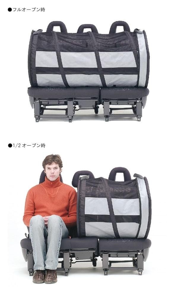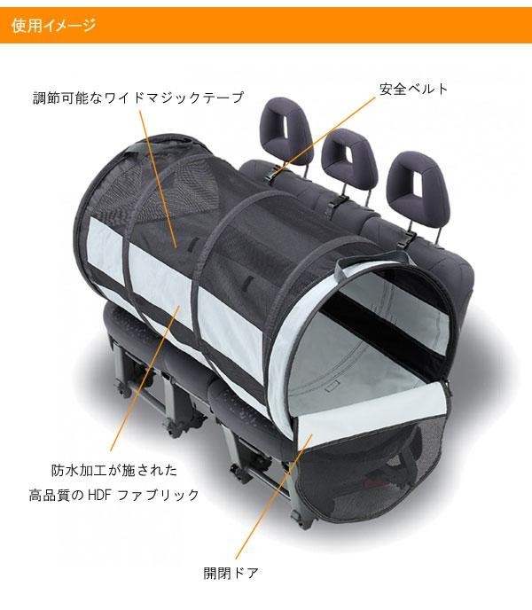 大切なペットのための「ペットチューブ」。まるでペットのお家のよう♪車を汚さないのでオススメです。3/4、1/2と長さの調節が可能なので、容易に後列シートでのスペース確保が可能です。 |