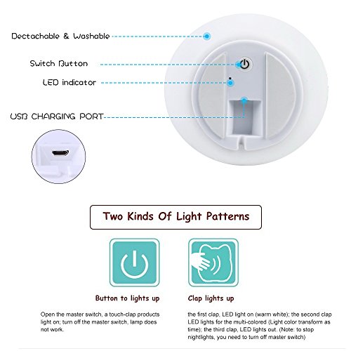 - ◕‿◕--Tap Control: Press power button on the bottom first, and then, LED light will stay Warm white. First Tap, it will change to Red light. Second Tap, it will change to Green light. Third Tap, it will change to Blue light. Fourth Tap, it will change to multicolor slow flash. Fifth Tap, it will turn off the LED light. Tap the soft silicone surface to switch among warm white light mode, 3 static colors, 7-color breathing light mode and standby mode, choose the lights modes as you wish freely.