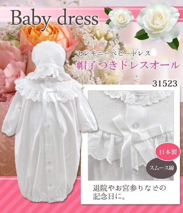 | お祝いの一日にもつかっていただけるベーシックなデザインです。股スナップの付け替えで、ねんねの新生児期は筒型ドレスで、動きが活発になってくる乳児期は股割れカバーオールで使えます。 |