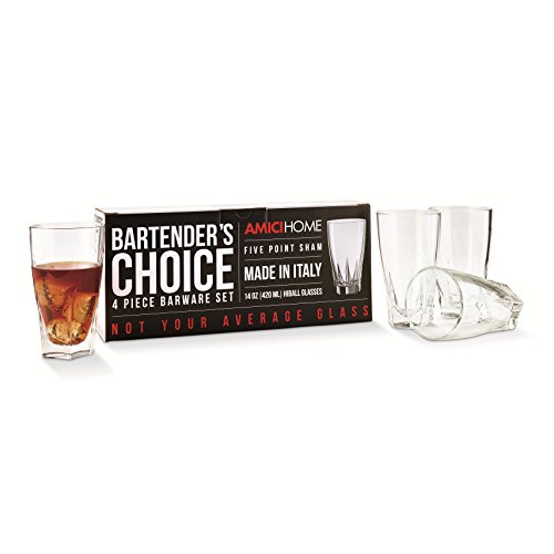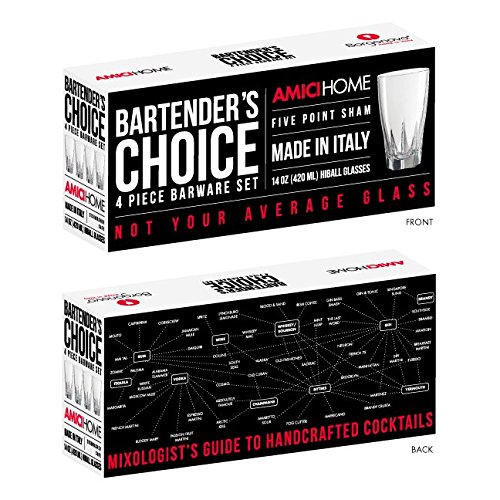 Studio : Amici Home Publisher : Amici Home Binding : Kitchen Product Description Amici Home's Bartender's Choice Camelot Hiball Glasses come in a set of 4. Perfect for serving cocktails or everyday use, these 14 oz. Italian glasses are made using soda lime glass The color box content is clever, thought provoking and fascinating; incorporating a collage of interesting "How To's", impressing facts and quirky details about your favorite cocktail, making these a great gift for your friends and family! These glasses measure 5.5"H x 3.25"D and are dishwasher safe. 0