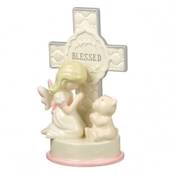 Beautiful ceramic figurine of a girl kneeling with her teddy bear at the base of a cross.