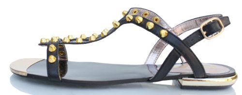 Product Description This black sandal features gold studded, faux leather upper, teardrop slingback design, high polish trimmed front and matching heels. Non-skid felted rubber soles. True to size. 0