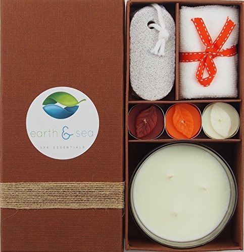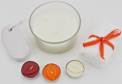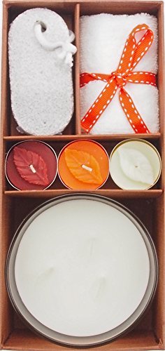 - EACH ITEM IS PREMIUM QUALITY - This set includes a large, cream colored 100% soy candle in a clear glass holder, three earth-tone tea light candles, each with an embossed leaf, a luxurious white 100% cotton bath cloth tied with a ribbon, and a palm siced pumice stone. The products in our gift set are crafted with all natural ingredients, are crueltry-free, and contain no dyes or artificial colors.