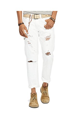 -. Binding : Apparel -. Brand : RALPH LAUREN -. Department : mens -. Feature : Sits below the natural waist / Slim fit through the seat and thighs / Belt loops / Buttoned fly with our signature shank closure / Five-pocket styling with our signature metal rivets -. ProductGroup : Apparel -. ProductTypeName : PANTS -. Title : Denim & Supply Ralph Lauren Men's Slim-Fit Ripped Destructed Jeans