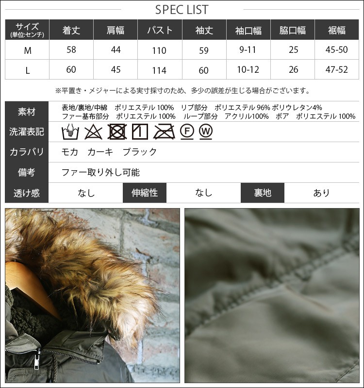 素材:表地/裏地/中綿 ポリエステル100% リブ部分 ポリエステル96% ポリウレタン4% ファー基布部分 ポリエステル100% ループ部分 アクリル100% ボア ポリエステル100%