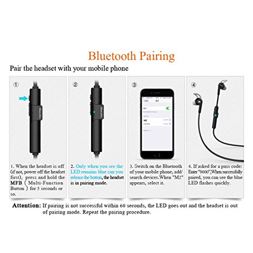 Feature : High-quality microphone on the lead for accepting calls while listening to music and Built-in Microphone featured noise reduction.Exclusive HD drivers deliver crystal clear sound, never miss any music detail. / Stereo sound with strong bass, You can enjoy the wonderful music anywhere and anytime with this amazing designs earbud.Unique ear tips(S/M/L size included) help to keep the earbuds in your ears. Plus the control unit is lighter and smaller, no pulling at workouts. / anytime with this amazing designs earbud Lightweight, comfortable earbuds,quality sound on the go, Human voice answering function, completely hands free / Connect two mobile phones simultaneously, Bluetooth capability allows you to contect wireless up to 30 feet with any bluetooth campatible enabled devices for music/audio streaming and to answer phone calls with built-in microphone / Long play time,up to 7 hours of listening and talk time, with the sport bluetoooth wireless headset, you can enjoy music for full day