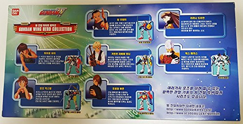 -. Binding : Toy -. Brand : Bandai Korea -. EAN : 8809170700831 -. Feature : 2002 Bandai Koea new / 7 figures collection set / figure size:3.7inch~4.7inch(9.5cm~12.5cm) / Box is written in English & Korean / good gift! collection! -. IsAdultProduct : 0 -. Label : Bandai Korea -. Manufacturer : Bandai Korea -. ProductGroup : Toy -. ProductTypeName : TOYS_AND_GAMES -. Publisher : Bandai Korea -. Studio : Bandai Korea -. Title : Gundam Wing Hero Collection Bandai Korea new