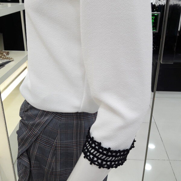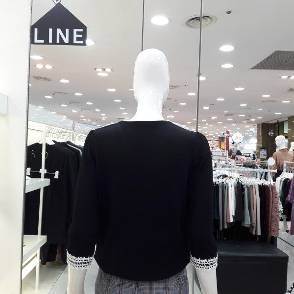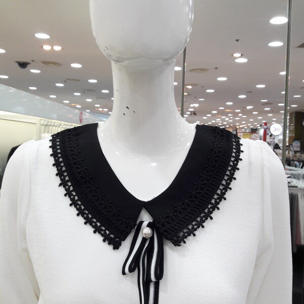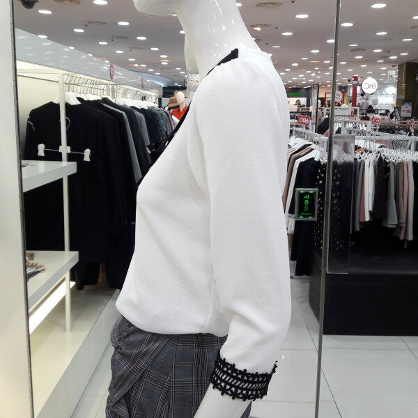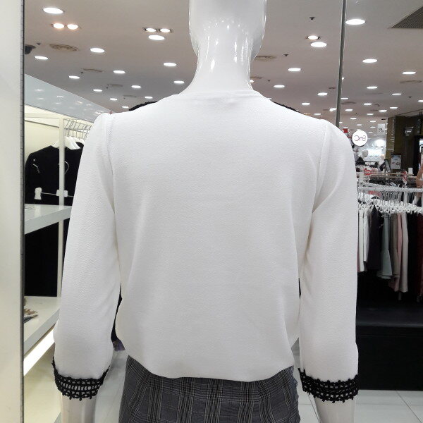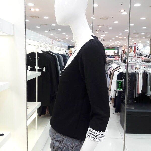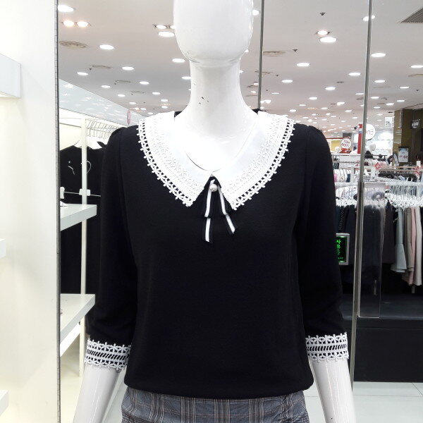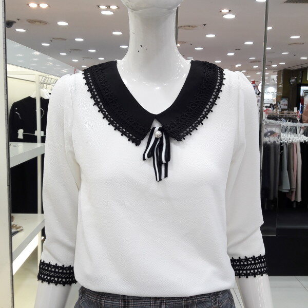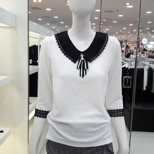 18년 배색 레이스가 러블리한 블라우스입니다 넥선 소매레이스가 여성스럽고 사랑스러운 8부 소매 디자인입니다 신축성있는 소채로착용이 편하며 청바지 스커트에 예쁜 스타일입니다