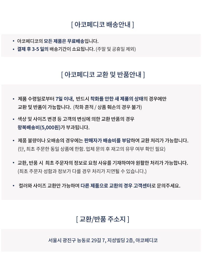 아코페디코 신발 특성상 신축성이 뛰어나 주문시에 사이즈에 딱맞게 주문해주시기 바랍니다. 예) 240~245 사이즈를 신으시는 분들은 240을 주문해주시기바랍니다.