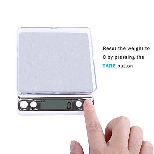 - PEFECT DESIGN - This scale is made up of stainless steel plate and BS plastic frame, make it durable enough.Very easy to clean. LCD display with blue backlight, you could use it even at night. Also with 4 function Buttons: Power / Mode / PCS / Tare, you could choose it according to your needs.