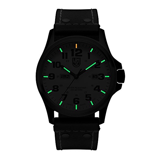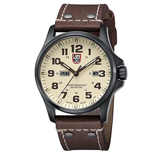 Brand, Seller, or Collection Name:Luminox Model number:1927 Part Number:1927 Model Year:2011 Item Shape:Round Dial window material type:Anti reflective sapphire Display Type:Analog Clasp:Buckle Case material:Stainless steel Case diameter:45 millimeters Case Thickness:14 millimeters Band Material:Synthetic leather Band length:Men's Standard Band width:25 millimeters Band Color:Brown Dial color:Beige Bezel material:Stainless steel Bezel function:Stationary Calendar:Day and date Special features:Luminous Movement:Analog quartz Water resistant depth:660 Feet