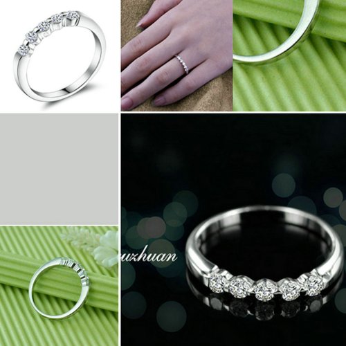 - Feature : Five top quality super shiny cubic zirconia are on the ring at a regular distance sparkling gracefully and beautifully. / Delicate in appearance, excellent for your outfit. Also it's an appropriate gift for anniversaries, graduations, birthdays, or just as a surprise to remind that special someone how much you care. / The ring is 18k white gold plated. Every cz crystal is about 0.1'' in diameter. / Shipped out in an exquisite jewelry gift box.The delivery date is about 3-8 days by AZ fulfilment Center. / One year warranty to ensure you a perfect shopping experience.