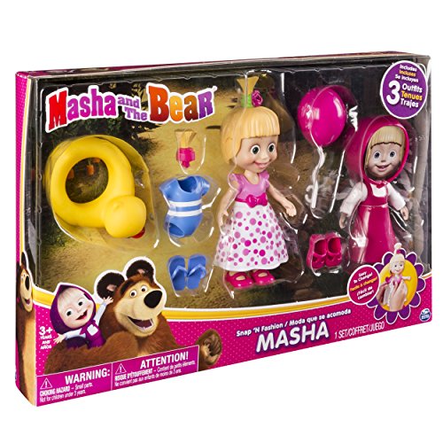 -. Binding : Toy -. Brand : Masha and the Bear -. EAN : 0778988652527 -. Feature : Snap 'N Fashion sets include a Masha doll and 3 unique outfits for her to wear. / Snap on outfits and accessories are easy to change! / Collect other Snap 'N Fashion Masha sets (sold separately) to create tons of fun themed outfits for Masha. / Snap 'N Fashion Masha is for ages 3+. No batteries required. -. IsAdultProduct : 0 -. Label : Spin Master -. Manufacturer : Spin Master -. Model : 20082017 -. MPN : 20082017 -. PackageQuantity : 1 -. PartNumber : 20082017 -. ProductGroup : Toy -. ProductTypeName : TOYS_AND_GAMES -. Publisher : Spin Master -. Studio : Spin Master -. Title : Masha and the Bear - Snap ‘N Fashion 1 - Masha Doll -. UPC : 778988652527 -. Warranty : No Warranty