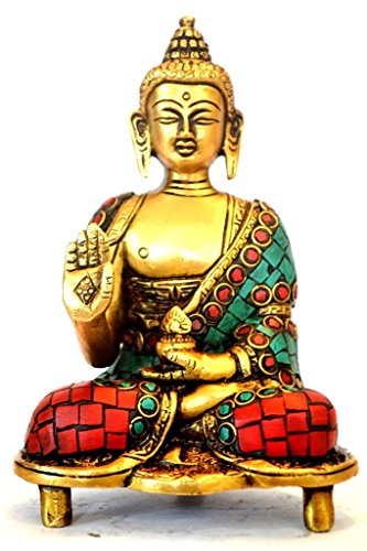 Studio : CraftVatika Publisher : CraftVatika Binding : Kitchen Product Description Enhance your home and garden by this graceful Antique Finish- vintage Buddha Statue, symbol of peace and harmony. The large Buddha is in Meditating Blessing Mudra and made of very high quality with detailed Turquoise Gemstones hand work. This would be a one of very exclusive statue in your collection. Such pieces are always very limited in quantity !! Large Buddha Statue in Meditating Blessing Mudra -Bringing Luck Prosperity and Absorb Negative Energy Gorgeous work of Colorful Turquoise stones- Antique Finish, Solid and Heavy Statue Origin: Tibet Size: Large 6 Inches (approx) Height ...Material- Brass (metal) and Handwork of Turquoise Gemstones. Gorgeous Buddha statue with colorful Turquoise gemstones stone work.. Size- 6 Inches height x 4.5 inches wide , Material - Brass , Turquoise other coral stone work Weight : 1.2 Kg 0