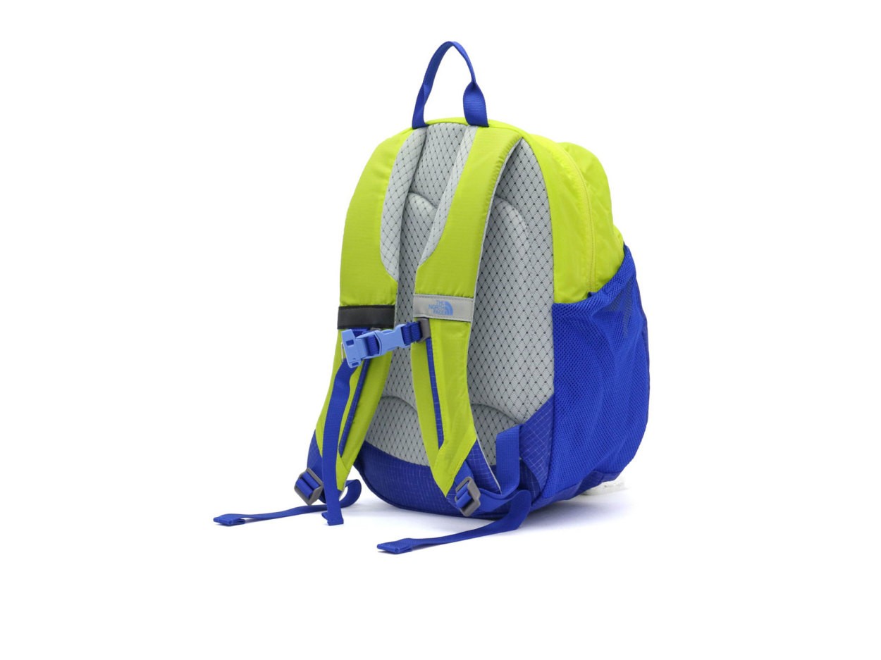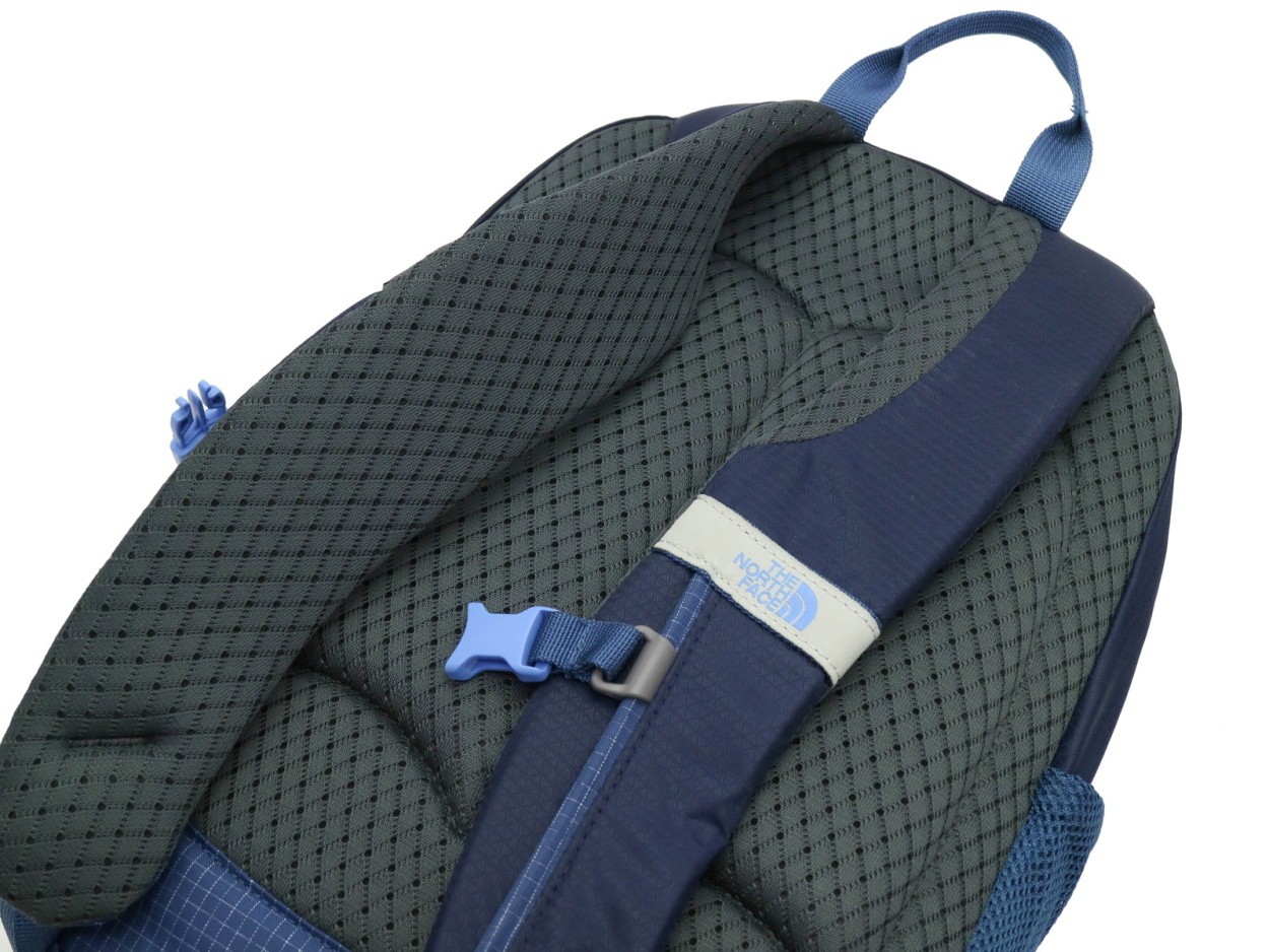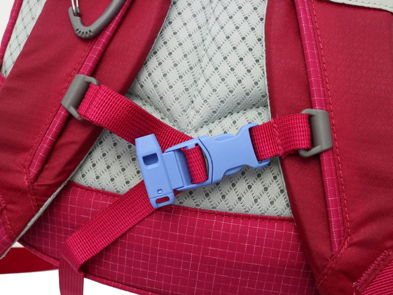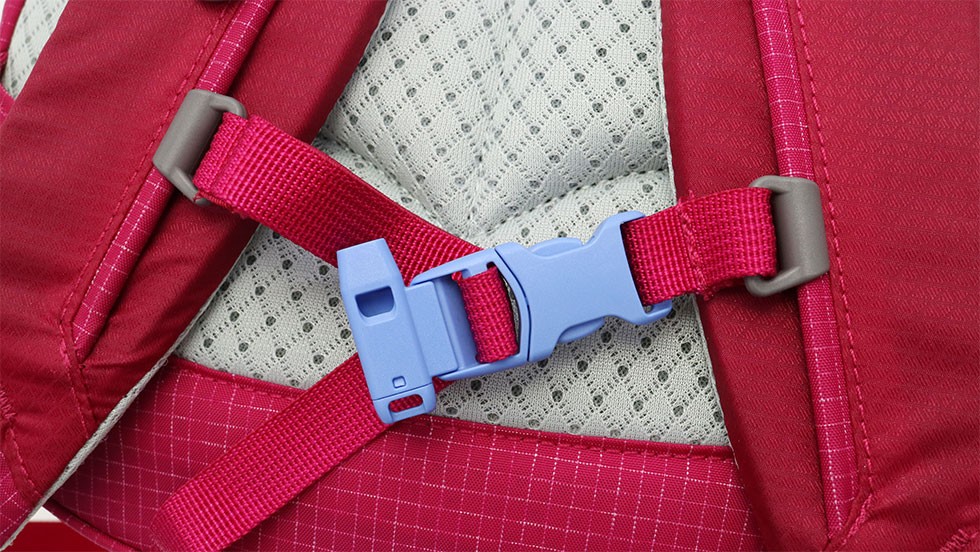 背面とリュックストラップには、パッドを内蔵させ、弾力と通気性に優れた素材を使用。長時間の使用にも、肩と背中への負担を軽減してくれます。また、チェストストラップにはホイッスルを設けているなど、安全性にも配慮されています。