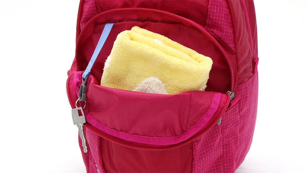 マチも備えた大きめのジップポケットを装備し、頻繁に出し入れするタオルなどの収納にも便利。キーフックを内蔵しており、鍵など、小さくて大切なアイテムも、失くさずに持たせることができます。