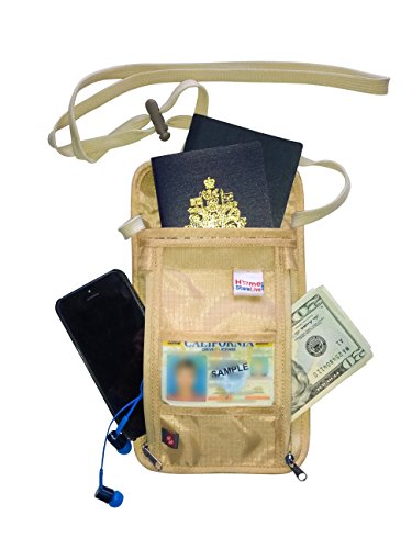-. Feature : RFID Passport Holder made of comfortable, breathable, tear resistant lightweight 210D Ripstop Nylon prevents illegal scans of digital information embedded on credit cards, bank cards and passports. / 8.0" X 5.5" Travel Neck Pouch features 4 smart storage compartments including two zippered pockets keeping travel documents, currency and credit cards organized and safe. / Black or Khaki Neck Wallet sleek design keeps important documents easily accessible when needed but securely concealed from others. Smart phone and valuables are easy to find. / Adjustable neck stash strap on the hidden travel wallet hangs comfortably around the neck, across the body or underneath clothing. / Travel wallet has a clear view ID window allows for quick access to identification for easier security checks.
