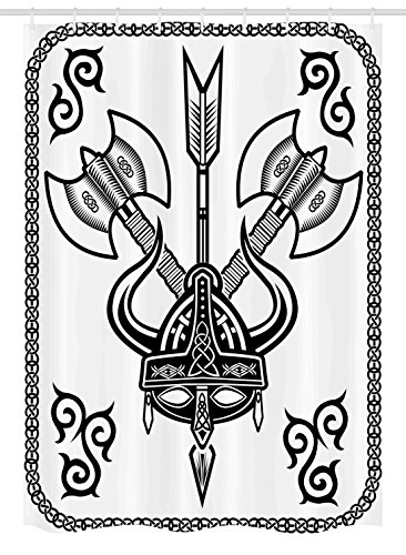 Viking Stall Shower Curtain by Ambesonne, Helmet with Horn Arrow Axe Antique War Celtic Style Medieval Battle Art Prints, Fabric Bathroom Decor Set with Hooks, 54 W x 78 L Inches, Black White