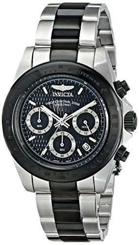 The Invicta Men's Speedway Collection Chronograph Black and Silver Stainless Steel Watch combines black and silver tones for a sporty, versatile look. A stainless steel bracelet band with a black accent stripe joins to a round, stainless steel case. A black bezel frames a textured black dial that offers three subdials and a date window at the four o' clock. Luminescent stainless steel hands, luminescent bar hour indicators, and white stick minute markers and tachymeter markings complete the dial of this adventure-ready timepiece from Invicta. This watch is water-resistant to 656 feet (200 meters).