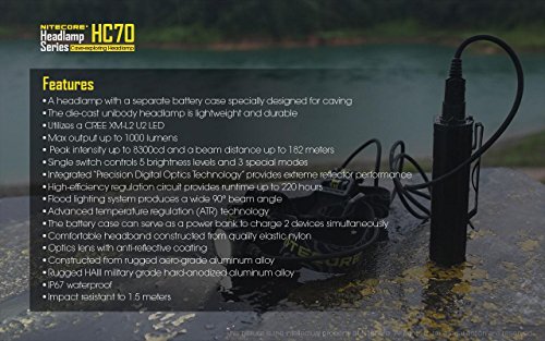 Studio : NiteCore Publisher : NiteCore Binding : Misc. Product Description Combo: Nitecore HC70 Rechargeable 1000 Lumen Headlamp w/2x NL183 2300mAh Batteries Free Eco-Sensa Battery Case
