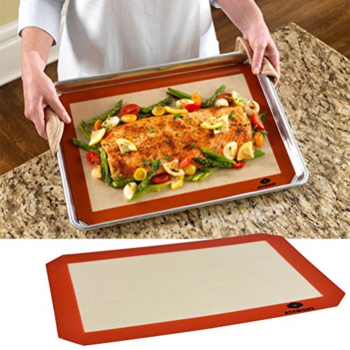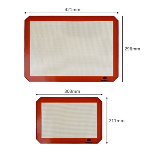 - 【Application】Silicone baking mat pass FDA and LFGB certified, suitable for baking cakes, pizza, macarons, pastries, biscuits or frozen meats, fruits and vegetables so on.