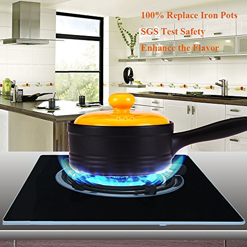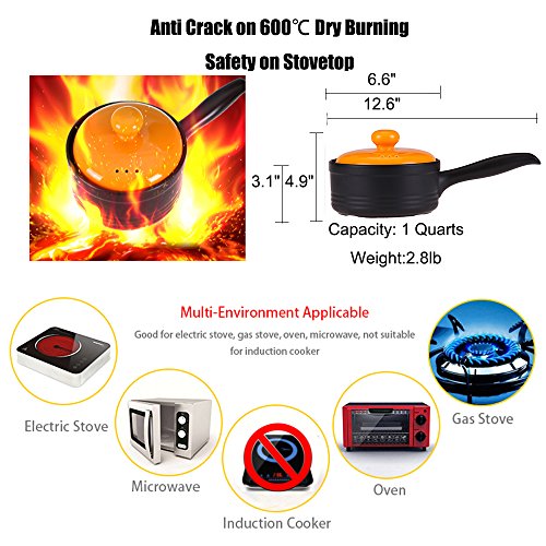 PRUDUCT FEATURES *Fired at 1350 degrees, ruled out all of harmful substance and safe-PFOA-free(Perfluorooctanoic Acid). Safety SGS tested and approved, 100% without toxic and heavy metals, lead free, FDA approved. *Anti-aging Acid and alkali glaze surface design, without the possible harmful fumes. *Broiler and oven safe up to 600 degrees and Crack-Resistant. *Nice supper strong lengthened handles, good protection from overheated handles, bottoms have a ring design and ventilation chambers, superior heat distribution and retention. *Works well on electric ceramic heaters, electric and gas stoves, oven, microwave and leftovers in refrigerator.(Note: Not suitable for induction cooker). * Dishwasher safe or hand wash with soap and water.