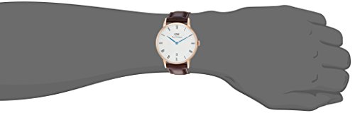 Rose gold-tone stainless steel case with a brown leather strap. Fixed rose gold-tone bezel. White dial with blue steel hands and Roman numeral hour markers. Dial Type: Analog. Date display at the 6 o'clock position. Quartz movement. Scratch resistant mineral crystal. Pull / push crown. Solid case back. Case size: 38 mm. Round case shape. Deployment with push button clasp. Water resistant at 30 meters / 100 feet. Functions: date, hour, minute, second. Casual watch style. Daniel Wellington Dapper Bristol White Dial Unisex Watch 1133DW.Feature