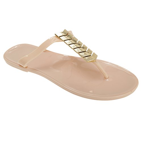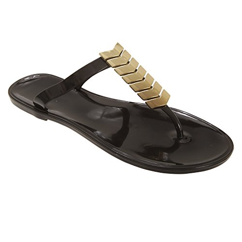 Product DescriptionLadies toe post jelly sandals with golden chevron detail. Choice of 2 colors. Choice of 6 sizes. Wipe clean only.0