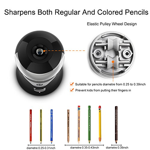 - ✔For Use with Multiple Pencil Styles:Just one insert hole with elastic pulley wheel design supports all type of pencil between 6.5mm - 11mm in diameter to meet various requirements of kids, students, adults, artists. Kids can safely use the pencil sharpener since it has a unique safety device that stops the pencil sharpener from working when the lid is removed .