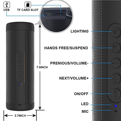 -. Feature : ❤️ Support: Wireless, Bluetooth, TF Card, Line in / ❤️ Portable Design: Mini size, Hook included / ❤️ Ingress Protection Rating: Shockproof, Dustproof / ❤️ Multifunction: LED Flashlight, FM Radio, buit-in Microphone / ❤️ Applications: Outdoor and Indoor(Party, Picnic, Camp, Shower, bicycle,etc)