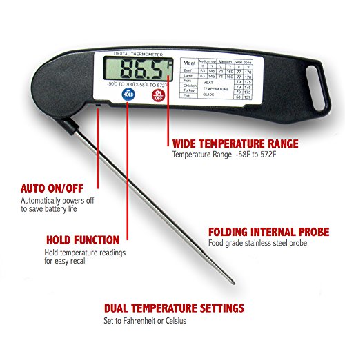 You'll love the design of this high quality folding Digital Food Thermometer. It’s great for meat, barbecue, smoking, candy liquids and more.