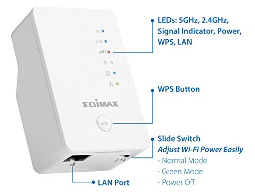 The Edimax EW-7438AC is an 11ac high-speed smart Wi-Fi extender with built-in power adapter and a compact design which plugs directly into an electrical outlet. Double the signal coverage of your Wi-Fi network for better Wi-Fi quality around your home. With smart iQ Setup, installation is quick and easy and the EW-7438AC features three operating modes: Wi-Fi extender, access point or Wi-Fi bridge. Use whichever mode you need for your network. Additionally, the extender complies with IEEE 802.11ac and IEEE 802.11 a/b/g/n wireless standards, for concurrent dual-band wireless speeds up to 750Mbps (300Mpbs on 2.4GHz + 433Mbps on 5GHz). With the Edimax EW-7438AC you can enjoy high-speed wireless networking throughout your home without additional cabling. And the EW-7438AC works together with the free EdiRange smartphone app to provide local Wi-Fi environment analytics as well as Wi-Fi scheduling functions and guest network management.Feature
