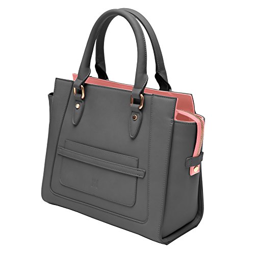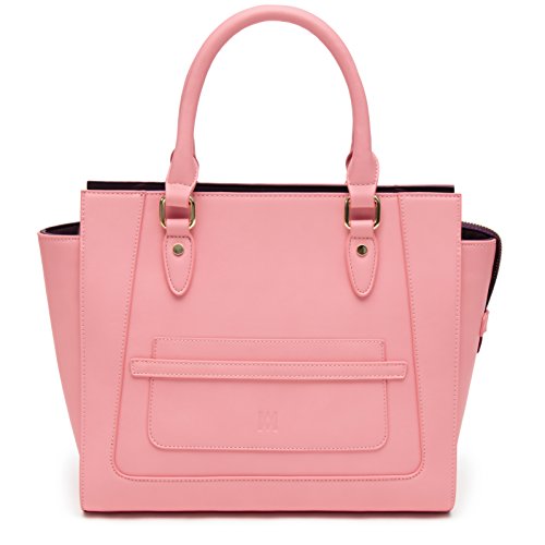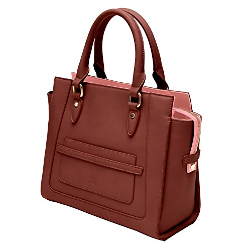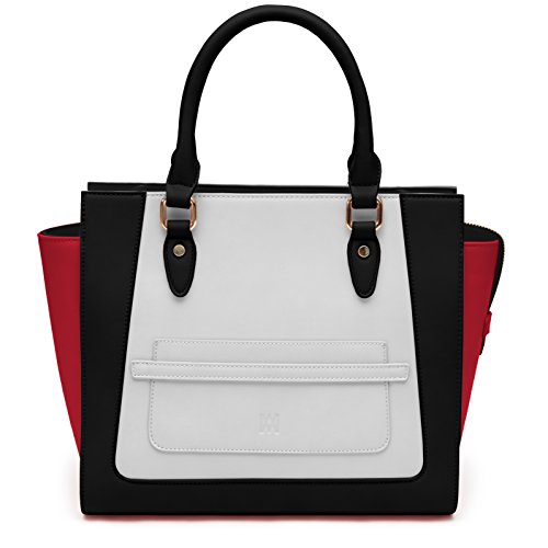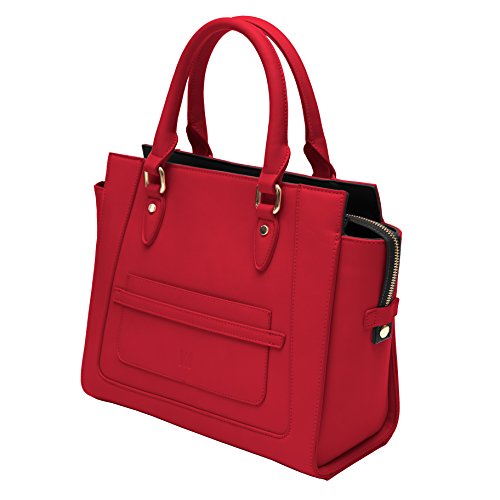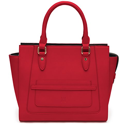 Marsi Bond Vegan Leather Handbags - Stylish and Humane Designer Purses Marsi Bond faux leather handbags are eco friendly and fashionable. The Michelle Tote is a professional looking, sturdy, structured handbag made from high quality, smooth, durable, vegan, faux leather fabric. This heavy duty crossbody features a small front slip pocket that is big enough to fit an iphone 8 or other large smart phone. All of our shopper totes feature a washable zip out lining for those times when you spill your makeup in your bag. Our Michelle Tote purse zips closed at the top with a rugged zipper locking your belongings safe and secure inside while your at work, shopping or on the go! Our top-handle tote bag also features an optional attachable shoulder strap making it easy to carry. The interior of the bag features a contrasting color and large interior wall pockets great for organizing your belongings so you can store-it-all! The exterior of the bag features smooth, soft vegan faux-leather, made from high-quality polyurethane (not PVC!), with a crisp embossed m-design logo and gold colored metallic hardware. Interior / Exterior color combinations include: - Black / Red