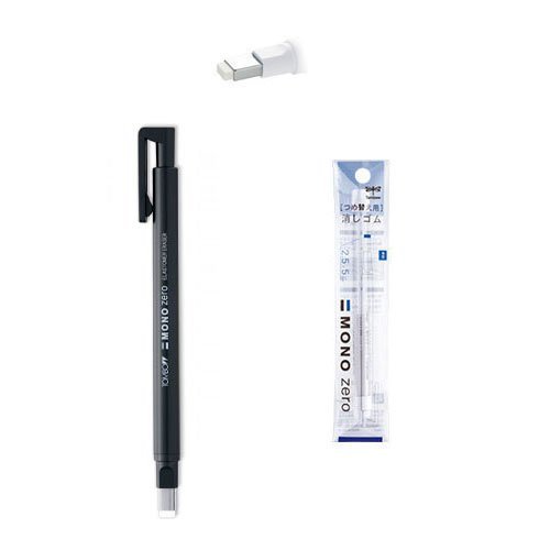 Tombow MONO Zero Pen-Style Eraser Square Tip + 2 Refills (Black Barrel)