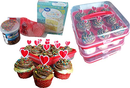 Valentine's Day Cupcake Liners Toppers with Carriers Bundle of 6 Items - Confetti White Cake Mix, Funfetti Chocolate Fudge Frosting, Heart Liners and...