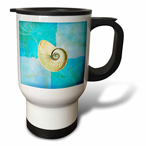 3dRose White Shell with Starfish Aqua and Blue Beach Theme Stainless Steel Travel Mug, 14-Ounce