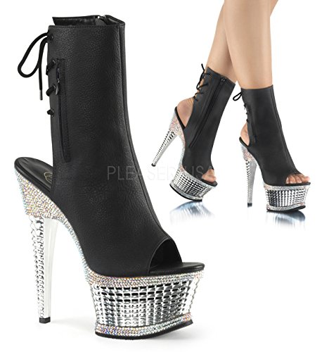 Binding : Apparel Product Description ILLUSION-1018RS/BPU/SCH features 6 1/2" (16.75cm) Heel, 2 1/2" (6.5cm) Chrome Plated Platform Open Toe/Heel Back Lace-Up Ankle Boot w/Hidden Zip Pocket and Slv Multi Rhinestones Embellished on Textured Platform Bottom, Inside Zip Closure 0