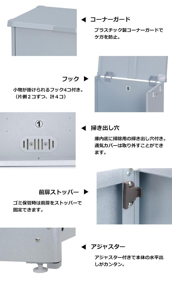 | 仕様 | 組立式 フック:4個 アジャスター:4個 前扉ストッパー付 45Lゴミ袋入数目安:2袋 |