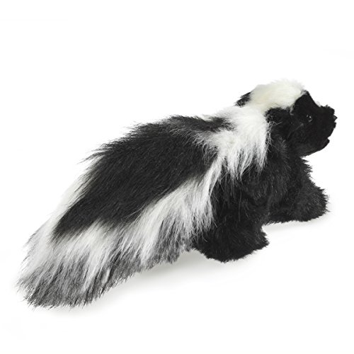 White stripes beautifully highlight the elegant sweep of long black fur on the hazardous hindquarters of this Skunk puppet from Folkmanis. With a workable mouth and tail, she can be posed in attack position. But don't worry; scent glands are not included. Ideal for use in interactive stage and puppet theater, Folkmanis Puppets are also great for teaching, daycare, school, pretend play, games and parties, or to pair with a book for storytelling. Easy to feed and care for, just add lots of love and snuggly fun. This puppet measures 14 x 4 x 5 inches (LxWxH). Folkmanis has been encouraging young imaginations to blossom since 1976 with its innovative and engaging specialty puppets, promoting creativity and discovery while winning nearly every industry, child development, and kid-tested award. Folkmanis has grown to become the premier manufacturer of plush puppets worldwide, offering over 200 of the most heartwarming and realistically designed creatures--both exotic and familiar--on the market today. (Birthday: January, 1998).Feature