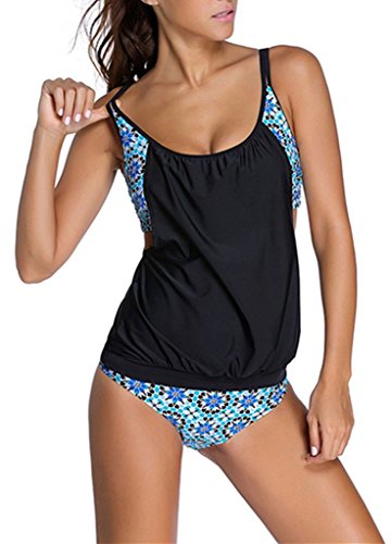 EVALESS Women's Floral Printed Two Pieces Relaxed Blouson Tie Tankini Swimsuit Small Size Navy