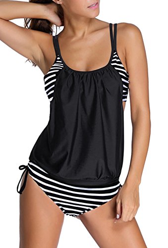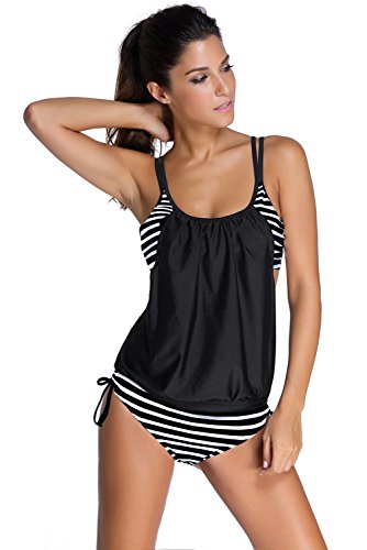 EVALESS Womens Casual Strips Sporty Double Up Tankini Top Swimsuit Set Medium Size Black&Blue