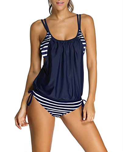 EVALESS Womens Casual Strips Sporty Double Up Tankini Top Swimsuit Set Large Size Navy Blue