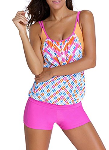 EVALESS Womens Blouson Padded Top and Boyshort Bottom Swimwear XX-Large Size Blue&Pink